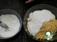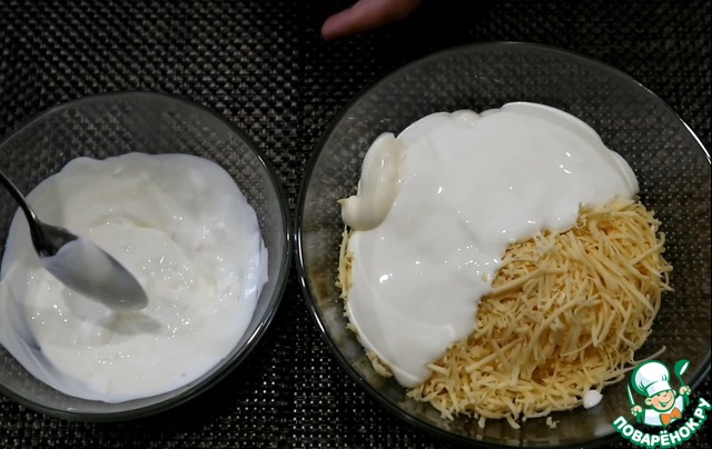 Измельчить чеснок и перемешать с 6 ст. л. сметаны. Все хорошо перемешать. Сыр натереть на мелкой терке и смешать с 3 ст. л. майонеза и 3 ст. л. сметаны. |