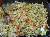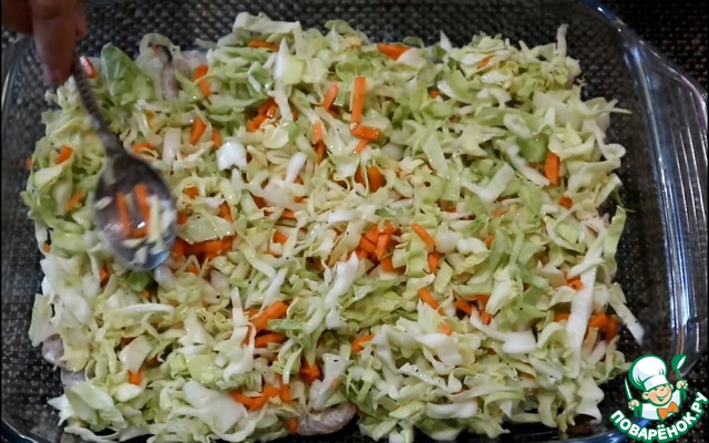 В форму для запекания выкладываем первым слоем мясо с луком, затем капусту с морковью. |