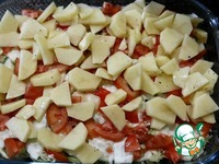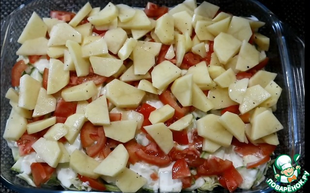 Далее выкладываем кабачки и смазываем сметано-чесночным соусом, наверх раскладываем помидоры и накрываем все картофелем. |