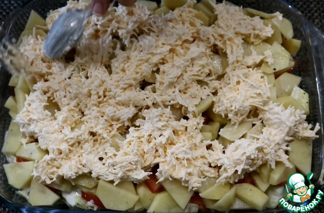 На картофель выкладываем сырную массу и распределяем его по всей поверхности. Овощную запеканку с мясом отправляем в духовку на 80-90 минут при температуре 170 градусов. |