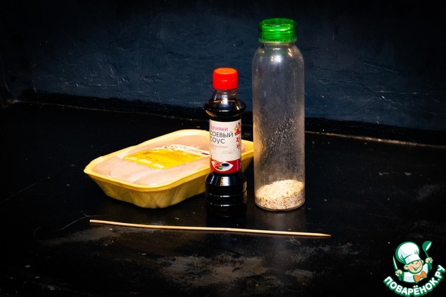 Для этих шашлычков нам понадобится куриное филе, соус терияки, и жареный кунжут, а так же деревянные шпажки, мангал и угли.