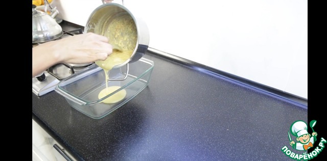 Когда довели до нужной консистенции, пока карамель еще горячая переливаем в форму в которой будем выпекать. И оставляем остывать. Она еще загустеет.