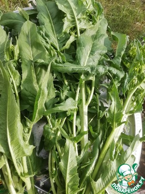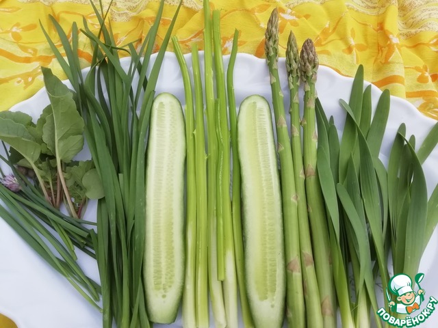 - Зелень (Дикорастущая капуста - букет, очищаем стебли, сердцевинки стеблей для салата, луки: шнит, батун, джусай, зелень чеснока немного 2-3стебелька, листья редиса небольшой обьем с 2-3 редисок) — 2 пуч.