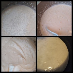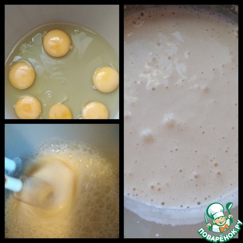 Для бисквита разбить яйца и взбить миксером сначала на небольшой скорости до образования пены, затем не останавливаясь взбивать частями добавлять сахар. Прибавить скорость и взбивать до увеличения объёма раза в 4.
