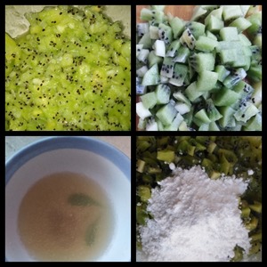Половину киви чистим и взбиваем в блендере, другую половину чистим и режем небольшими кубиками. Желатин замачиваем в воде до набухания. Соединяем пюре из киви с кубиками и добавляем сахарную пудру, размешиваем и немного подогреваем в микроволновке или на газу до тёплого состояния. -