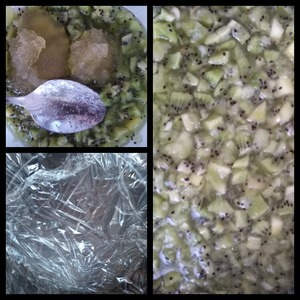 В тёплую смесь из киви добавляем набухший желатин, хорошо перемешиваем до растворения. Форму (диаметр 20 см) застилаем пищевой плёнкой и выливаем туда смесь из киви, разравниваем и убираем в холодильник до застывания.