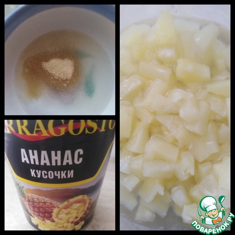 Теперь готовим ананасовое компоте (прослойка). Желатин заливаем водой до набухания. Достаём из банки ананасы кусочками вместе с соропом. Если кусочки крупные, то порезать помельче. Добавить сахарную пудру, перемешать и поставить подогревать до тёплого состояния.