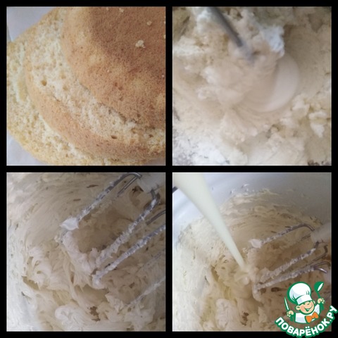 Лопаткой аккуратно смешать взбитые массы, творог+сахарная пудра и масло+сгущёнка, наш крем готов. Собираем торт.