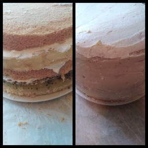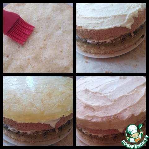 Берём 1-й корж (верхушка бисквита) и пропитываем сиропом. Затем наносим крем и разравниваем. Прослойку из киви кладём на крем. И сверху снова промазываем кремом.