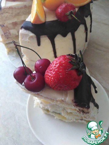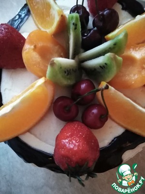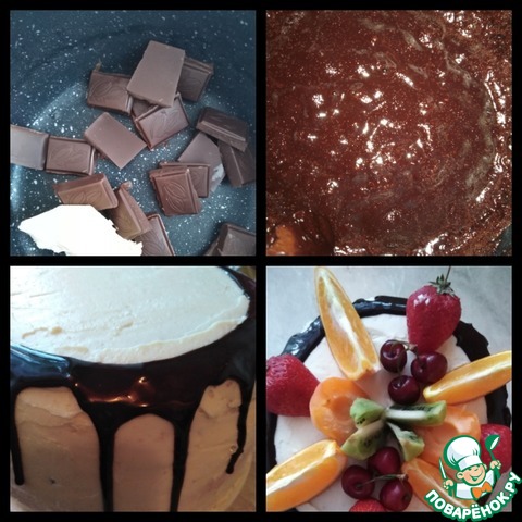 Шоколад растопить и остудить. Перелить в кондитерский мешок. Пройтись по краю торта делая подтеки. Украсить верх свежими фруктами.
