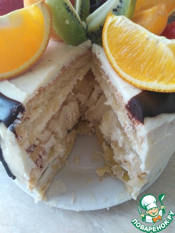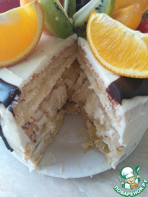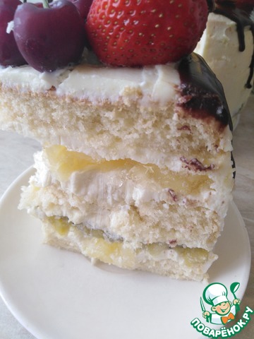 Накрываем вторым коржом и пропитываем сиропом. Наносим крем и выкладываем ананасовую прослойку. И снова наносим крем.