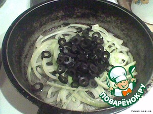 Лук режем полукольцами, маслины колечками и жарим на растительном масле.