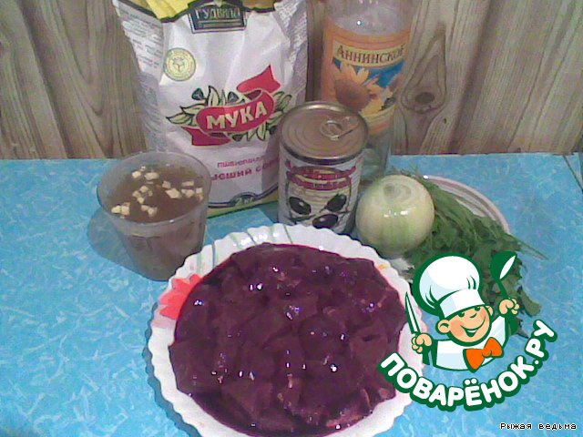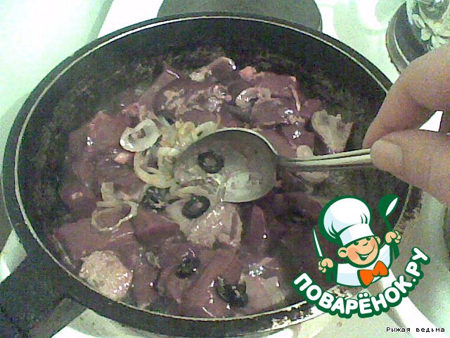 В обжаренный лук с маслинами добавляем печень. Перемешиваем.