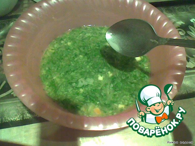 Смешиваем просеянную муку, бульон и зелень. Разбавляем соус водой (примерно 1 стакан), солим.