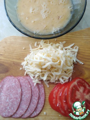 Яйца посолить, поперчить и взбить. Помидор и салями нарезать кружочками. Сыр натереть на тёрке.