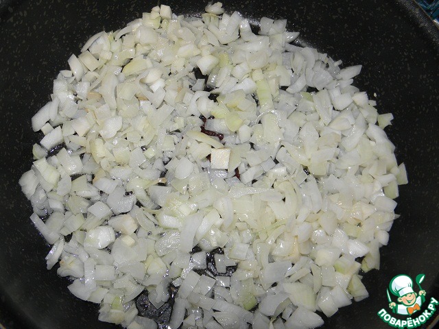 Лук с чесноком мелко нарезаем и пассеруем на масле