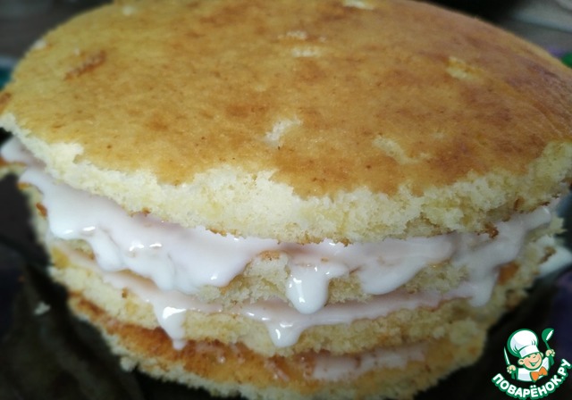 Вырезаю 4 коржа при помощи круглой тарелки, ещё теплые смазываю кремом.