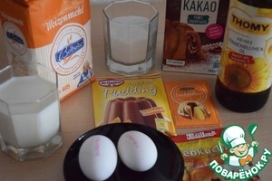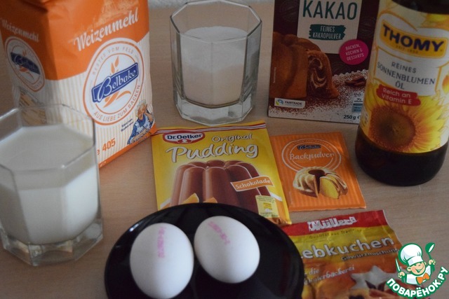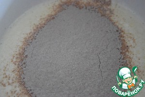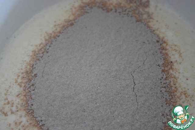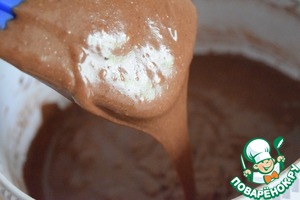 Муку, разрыхлитель, сухой пудинг, специи и какао-порошок смешать и просеять через сито.
