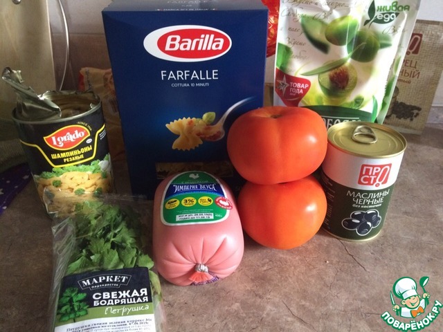 Впервые я купила этот салат в отделе кулинарии магазина "SPAR" и влюбилась в него с первой вилки. Сейчас вышеназванный магазин больше его не готовит, а точный рецепт узнать невозможно. Однако мне удалось воссоздать блюдо самостоятельно и захотелось поделиться им с вами. Салат приятный и сытный, состоит из макарон (фарфалле), ветчины, шампиньонов, маслин и помидоров. Подходит в качестве полноценного ужина или блюда на праздничное застолье. Угощайтесь!