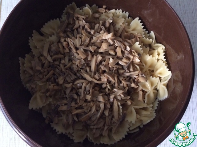 Добавляем грибы в миску к макаронам.