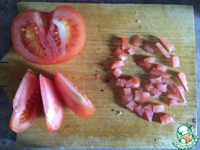 Помидоры режем дольками, удаляем семена и жидкость, нарезаем небольшими кубиками.