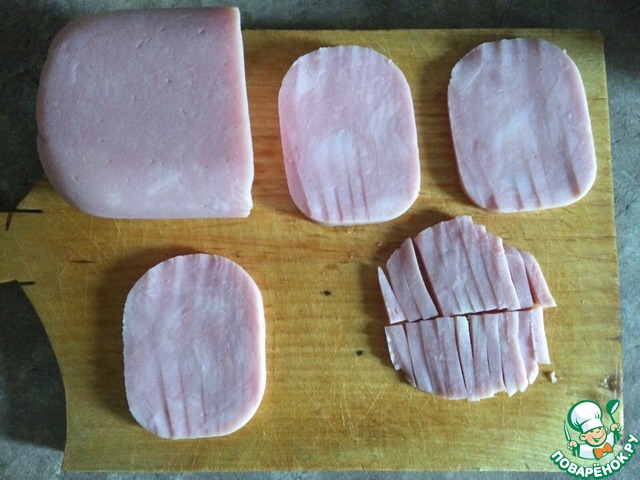 Ветчину режем ломтиками. Получившийся ломтик режем пополам, а затем соломкой.