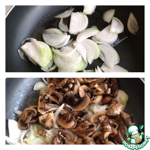 Лук нарезать полу кольцами и обжарить буквально пару минут на растительном масле. Огонь достаточно сильный. Затем добавить шампиньоны нарезанные пластинками. Обжарить вместе с луком помешивая минут 5-7.