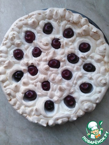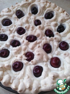 Теперь безе нужно выложить на тесто, можно просто ложкой, но я переложила его в кондитерский мешок и насадкой отсадила "облака". Теперь в каждое облачко кладём вишенки. Ставить в разогретую духовку при 180 градусах на 25 минут. Ориентируйтесь на особенности вашей духовки. После выпекания оставить пирог в духовке ещё минут 7.
