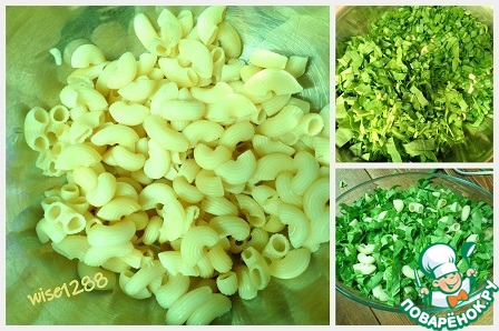 • Макаронные изделия отварить в течении 7 минут. Разогреть духовку до 200 градусов. Соединить шпинат, зеленый лук с макаронами, переложить в форму для запекания.
