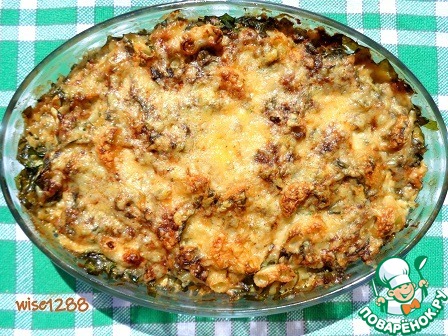 • Перелить соус в форму для запекания, равномерно распределяя по всей поверхности. Сыр нашинковать и засыпать сверху на шпинатную массу. Выпекать 20 минут при температуре 200 градусов.