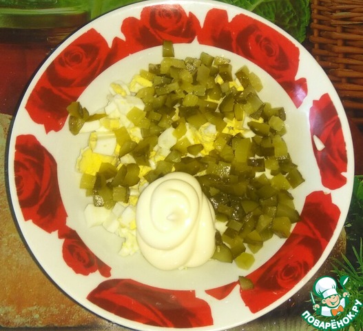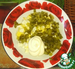 В миске соединить яйца, огурцы и майонез. При необходимости посолить, поперчить.
