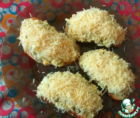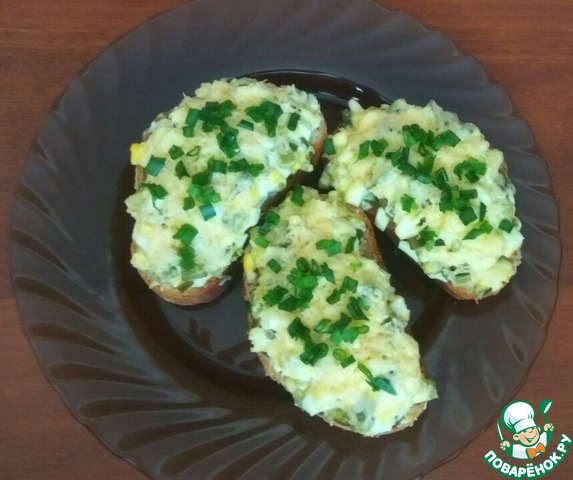 Готовые бутерброды посыпать мелко нарезанным зелёным луком. Кушать лучше тёплыми.