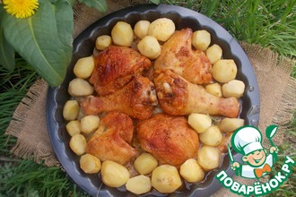 Я делала без картошки, и не целые окорочка а голени. Люблю несложные маринады, которые сохраняют вкус самой курицы и лишь подчёркивают его, а не перебивают!
