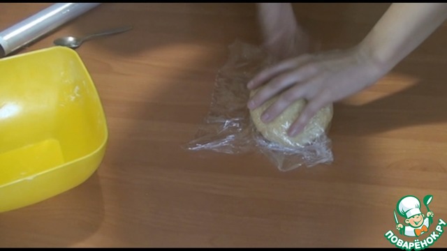 В просеянную муку добавляем соль, разрыхлитель, растопленное сливочное масло, яйца и замешиваем тесто, если получается очень крутое добавим несколько ложек молока. Тесто долго не вымешиваем, собрали все вместе и достаточно. Заворачиваем в полиэтиленовую пленку и отправляем в холодильник на полчаса, пока мы приготовим начинку.