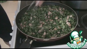 Для начинки нарежем ветчину кубиками, зеленый лук и укроп мелко порубим. На сковороде растопим сливочное масло, добавим подсолнечное и обжарим ветчину, потом добавим зеленый лук и обжарим минут 5, чтобы он стал мягким и впитал в себя ароматы масла и ветчины. Солим и перчим по вкусу. Начинку переложим в миску, чтобы быстрее остыла и добавим укроп, перемешаем.