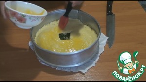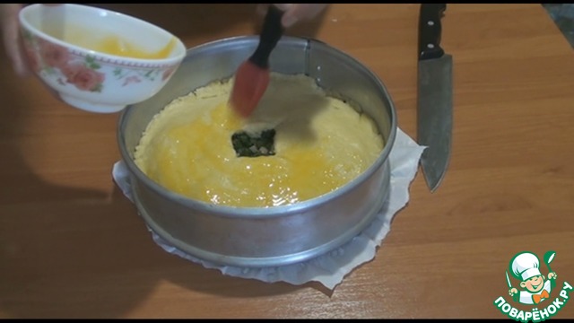 Вторую часть раскатываем на пергаментной бумаге по размеру формы и переносим на пирог, прям с пергаментом, потом аккуратно убираем пергамент и защипываем края. Посредине делаем отверстие, чтобы было куда выходить горячему воздуху. Смажем пирог желтком и отправляем в разогретую до 180 градусов духовку на 30 минут. Готовность проверяем деревянной палочкой, она должна выходить сухой. Пирог вкусен как в горячем виде, так и холодным. Приятного аппетита!