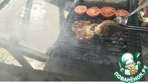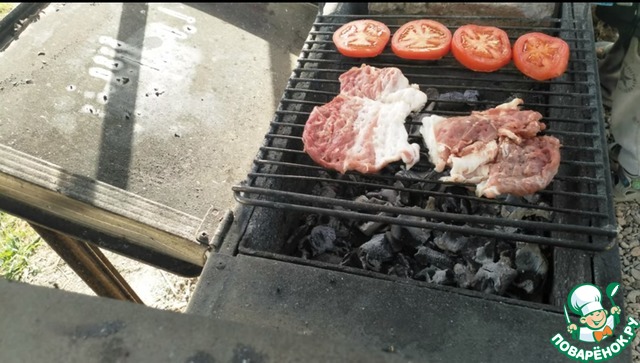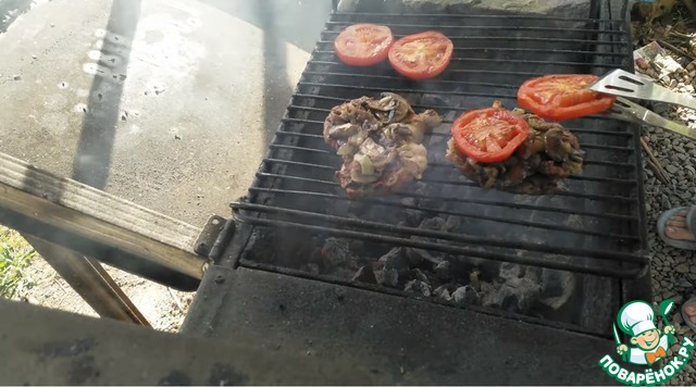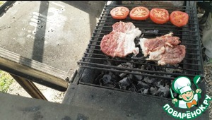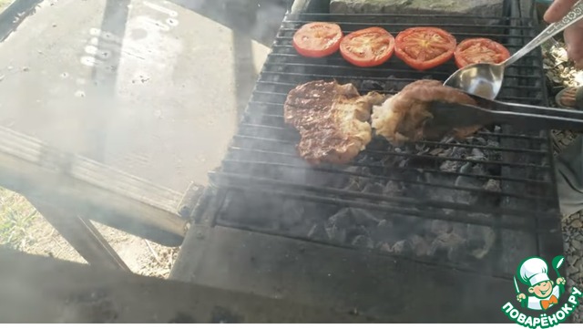 Выкладываем на решетку отбивные и помидоры. Мясо солим и перчим