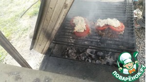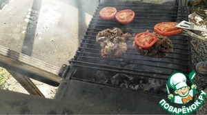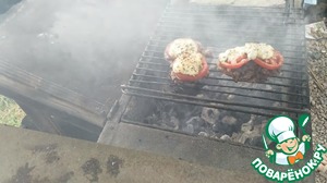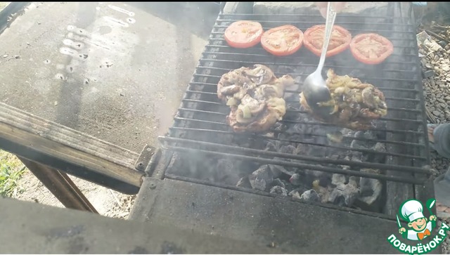 Экспериментальный вариант в итоге нас порадовал. В общем название блюда "Мясо по французски" но мы не будем так пафосно выражаться и решили сделать то, что всегда делаем в духовке. Это свиные отбивные под грибами, помидорами и сырной смесью. В чем эксперимент? Мы его приготовили на мангале. Как сказал выше, результат нас очень порадовал.