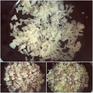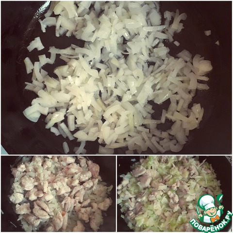 К луку добавляем куриное мясо, нарезанное небольшими кусочками. Жарим буквально 2-3 минуты.