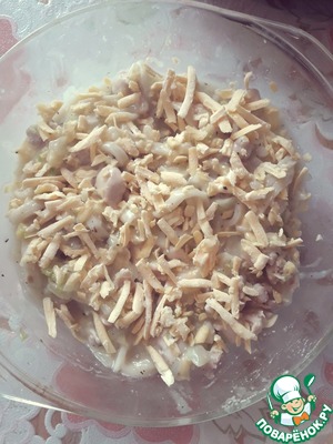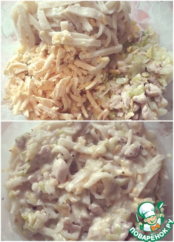 В форме смешиваем курино-овощную смесь, лапшу и часть тертого твердого сыра. Кстати, можно так же добавлять плавленный сыр вместо твердого, получается более сливочно и нежно.