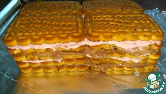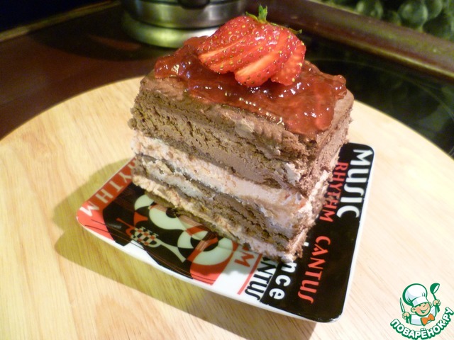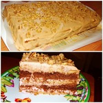 [+5]В холодильнике провёл около пяти часов. Печенье шоколадное 2 слоя и 3 слоя обычное. А глазурь с карамельной белой шоколадкой и без какао. Сверху орехами грецкими посыпала. Настоящий торт!