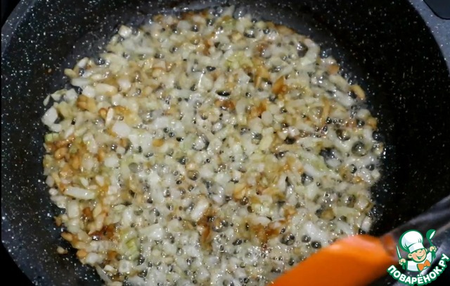 • Измельчить лук и чеснок. Сковороду разогреть с растительным и сливочным маслом. Обжарить лук с чесноком, добавить по щепотки соли и сахара. Жарить до золотистого цвета.