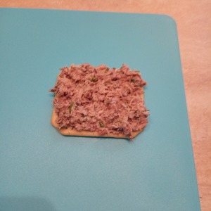 • Рыбу разобрать, освободив от косточек и хорошо размять вилкой. Добавить ложку-другую заправки, поперчить, полить соком лимона и перемешать. Масса не должна быть очень сухой, но и не очень влажной, иначе крекеры будут быстро размокать!