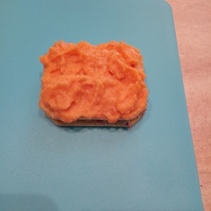 Должно получиться два слоя из рыбной пасты, а между ними один слой из морковной.