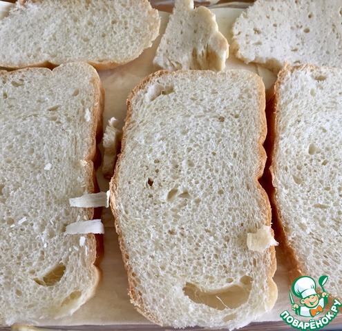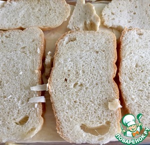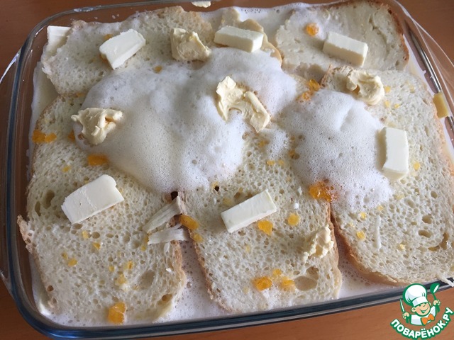 Огнеупорную форму смазать маслом. Выложить хлеб, нарезанный кусочками.