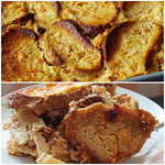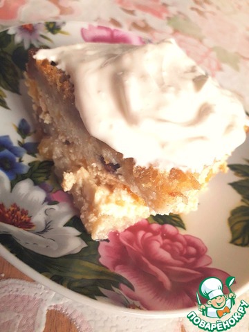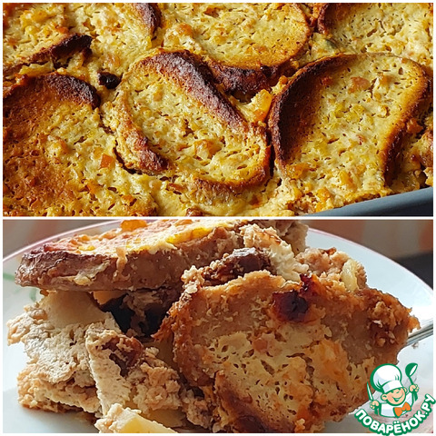 На первый слой хлеба выложить творожный слой, затем ещё слой хлеба. Полить всё яичной смесью, сверху положить мелкие кусочки масла. Поставить форму в разогретую до 200 градусов духовку на 70 минут.