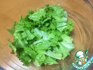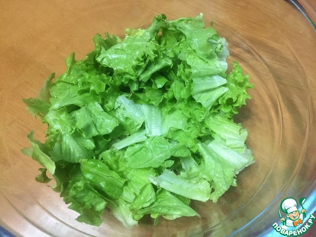 Салат промыть, обсушить бумажным полотенцем, порвать и выложить в миску.