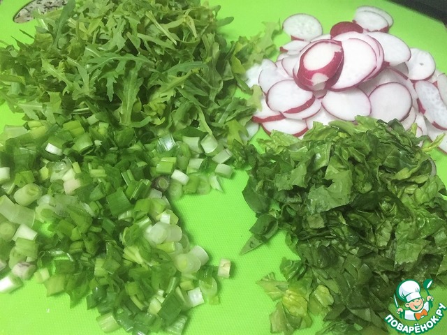 Рукколу промыть, обсушить, порвать руками. Лук измельчить, промытый шпинат порубить. Редис нарезать кружками или половинками кружков, если он крупный.