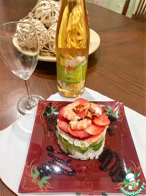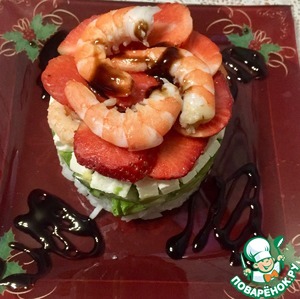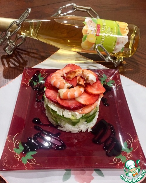 Рис, сельдерей, авокадо, брынза, креветки. Верхний слой из нарезанной клубники.