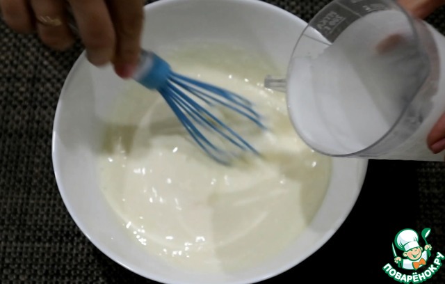 В миске смешать яйца, соль, сахар. Затем налить кефир и перемешать.